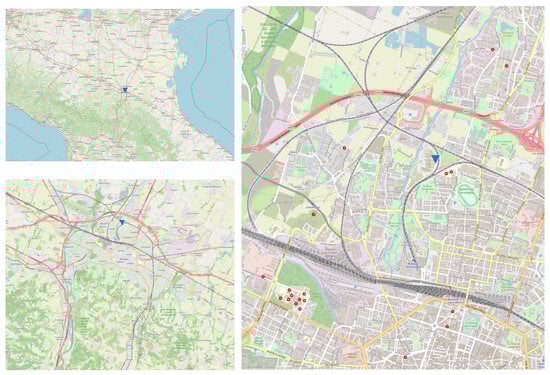 Location of the reference station site in Bologna, in decimal degrees (DD): (44.523698, 11.340034). The figure on the top left shows the position of the site (shown by a blue triangle) in the city of Bologna in northern Italy. The figure on the bottom left shows the position of the site (shown by a blue triangle) in the city of Bologna. The figure on the right shows a zoomed area in the city of Bologna where the site, shown by the same blue triangle, is located.