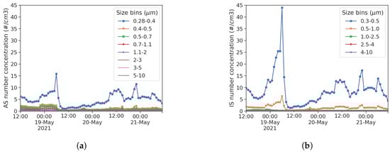 where i is the particle size bin, is the mass concentration in /m3, is the particle average density, is the median particle diameter in , and is the number concentration for a given size bin. It is immediately clear from Equation (1) that a good estimation of as the input parameter for the conversion algorithm is crucial. A widely adopted value is /cm3 [32], but its variability in time and space must be carefully considered after relocation. The mass conversion based on Equation (1) requires to be known in each size bin; this information is not always available for LCSs. Sensirion SPS30 provides a typical particle size output that is correlated with the weighted average of the number of concentration bins measured with a reference particle sizer. Substituting in Equation (1) leads to the calculation of a typical particle mass, which can be used to perform a manual conversion whose results are shown in Figure 4. Pearson correlation between LCS and AS increases from to in this case. An alternative approach proposed in this study instead relies on the calculation of a constant ratio, , between mass and particle counts in the chosen bin from reference instrumentation data. The defined quantity can be seen as the average particle mass used to calculate a corrected mass concentration from the number concentration of the LCS. The latter is a direct and more reliable measurement, as shown by Figure 4. With the correction method according to the reference station’s average particle mass, the Pearson correlation of PM values between LCS and AS increases from to , a value that is again comparable to the correlation between particle number concentration.