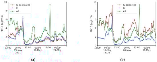 Particle count to mass concentration conversion: (a) calculated from particle count according to Equation (1); (b) corrected according to reference station average particle mass.