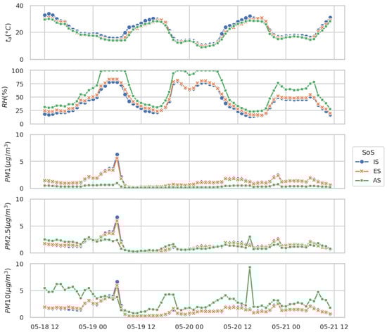 Two independent measurement systems (IS and ES) based on Arduino Mega 2560, (manufactured in Italy, Turin, by Arduino srl), were built for the measurement of environmental parameters [20,21]. The systems have a onboard Real-Time Clock (RTC), a data logger on flash memory, a fan, and a TFT display. The RTCs of the two systems are constantly synchronized thanks to time data received from the GPS module. Both systems can measure the concentration of particles in air matter (PM) (Sensirion SPS30 sensor, manufactured in Zurich, Switzerland, by Sensirion AG), the concentration of TVOC in the air (Sensirion SGP30 sensor), the concentration of air CO2 (Winsen MH-Z19B nondispersive infrared sensor, manufactured in Zhengzhou, China, by Zhengzhou Winsen Electronics Technology Co., Ltd.), the formaldehyde concentration (Winsen ZE08 sensor, manufactured in manufactured in Zhengzhou, China, by Zhengzhou Winsen Electronics Technology Co., Ltd.), the temperature, relative humidity and pressure of the air (Bosch Sensortec BME280 sensor, manufactured in Reutlingen, Germany, by Bosch Sensortec GmbH), air flow velocity (hot wire analog sensor), and GPS position. The systems are equipped with a fan that transports air inside the device enclosure, where CO2 and formaldehyde sensors are mounted, while the SPS30 sensor is equipped with its built-in fan. Both systems independently sampled data in 10 s intervals. All digital sensors used in the measurement device include a microcontroller that implements optimization and self-calibration algorithms. Among all the quantities measured by the low-cost SoS, only some sensors have been validated, i.e., those that overlap with the reference instrumentation. These are shown in Table 1, together with the available daily values from the ARPA reference station. The BME280 sensor was used for temperature and humidity measurements, while the SPS30 sensor was used for PM concentration measurements in the LCSoS. In Table 1, IS and ES are the two independent LCSoSs, while AS refers to the equivalent equipment measurement system of the ARPAE considered for validation. In Table 1, MSR means the Main Site Reference data, i.e., the daily measurements obtained by the ARPAE reference equipment [22].
