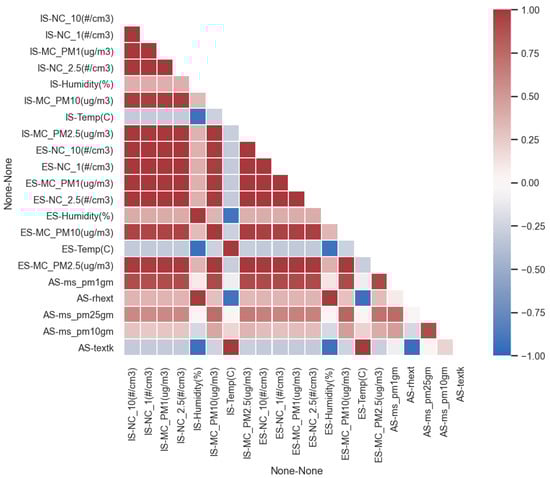 The two LCSs show an excellent consistency between themselves, as shown in Figure 5. This result has been shown by other studies [26]. Good agreement on temperature data is also found, while for the other measurement a statistical analysis is needed. The innovative approach adopted in this paper starts from a qualitative analysis based on a correlation heatmap in order to choose the variables. The global correlation heatmap is shown in Figure 6. The figure shows the correlation between multiple variables as a color-coded matrix. Five variables of interest were selected considering their overall correlation with the concentration of mass of particulate matter: air temperature, relative humidity, PM1, PM2.5, and PM10. In contrast, variables that showed a poor Pearson correlation coefficient R were ignored.