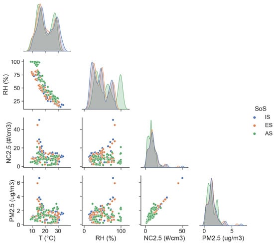 The plots give an estimate of the probability density functions of the variables based on the measured data points. Figure 7 shows the peaks that correspond to the modes of the distribution. Particular attention must be paid to RH, as it has a direct impact on the sensing mechanism of OPCs, and poor performance at full scale raises an alert. With respect to PM, correlation seems to decrease with the range from smaller particle sizes to larger ones. In the previous sections, a quantitative analysis of SoS performance was given, with a focus on the effects of time granularity, relative humidity, mass conversion from particle counts, and size detection response. Prior to that, an accent must be put on the small PM values observed during the test, thus making the instrumentation operate at the low end of the measurement range.