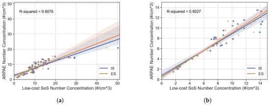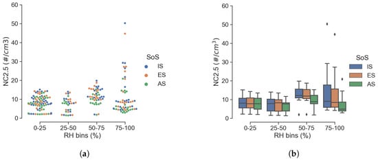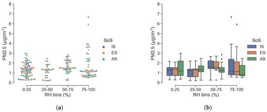 It is well known that among the factors that influence PM measurements, RH plays a major role. This is true to the point that reference gravimetric methods rely on a controlled sampling process in terms of the temperature and relative humidity of the air sample across the filter. These methods are not applicable for LCS and the definition of an RH correction factor is quite common [14]. To evaluate the influence of RH on the sensor response, we can look at the particle sizes in Figure 8 and Figure 9, which show scatter and box plots of number and mass concentration for . The RH values were aggregated in four uniformly spaced bins, which provided information on the statistical dispersion in each RH bin. Although in agreement among themselves, the low-cost SoS of IS and ES has a wider interquartile range, together with a greater number of outliers; the worst scenario corresponds to RH values greater than 75%.
