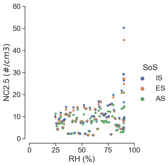 Similar consideration can be drawn from Figure 10, which reports the same quantities but without binning. An increased dispersion of the data is noticeable with growing RH values; also, in this case, higher particle counts associated with high RH values do not fit well with the reference system AS. Note that the dispersion of data points increases in the transition from particle count to particle mass, probably as a result of the theoretical mass conversion adopted in OPCs.