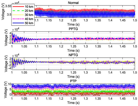 Voltage signal patterns at different distances: Normal, PPTG, NPTG, and PTP.