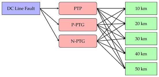 Figure 4 illustrates the relationship between DC line fault types and their corresponding locations. The diagram includes three fault types, PTP, PPTG, and NPTG, along with five DC line sections divided at intervals of 10 km, 20 km, 30 km, 40 km, and 50 km. When a fault occurs on the DC line, the model first identifies the fault type (PTP, PPTG, or NPTG) and then determines the fault’s location within a specific section (e.g., 10 km, 20 km, etc.). These fault types can occur in all sections, and the voltage and current signal characteristics vary depending on the fault type.