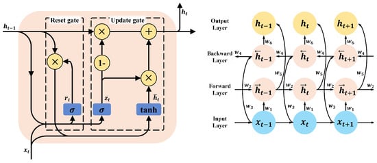 The Bi-GRU network constitutes the core of the model, responsible for feature extraction and temporal modeling. Unlike traditional GRU, the Bi-GRU architecture processes input sequences in both forward and backward directions, allowing it to capture dependencies from both past and future time steps. This bidirectional flow of information is particularly advantageous for fault diagnosis, where signals preceding and following a fault event provide critical diagnostic information [36,37].