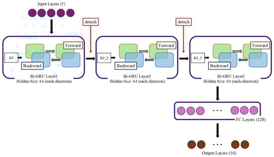 The core of the model consists of two Bi-GRU layers, each with 64 hidden units in both forward and backward directions. This configuration enables the model to extract relevant temporal features while retaining critical bidirectional dependencies. The hidden state generated by the first Bi-GRU layer is passed to the third layer, ensuring a hierarchical extraction of patterns. The architectural structure of the Bi-GRU, including its bidirectional layers and hierarchical feature extraction capability, is illustrated in Figure 6.