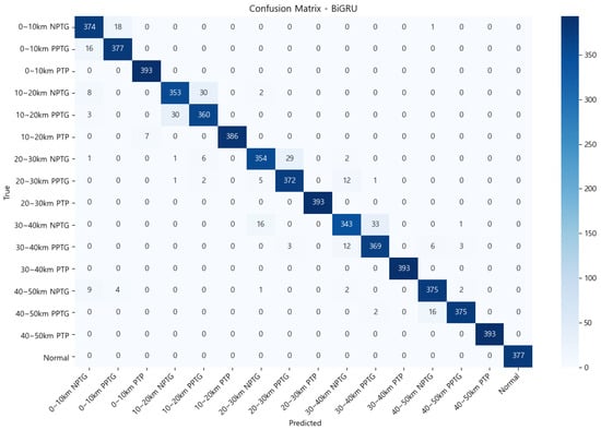 To support this analysis, a Bi-GRU-based model was employed. The Bi-GRU model leverages bidirectional information flow to process time-series data and efficiently learn the relationships between fault signal patterns and their locations. The model outputs a total of 16 classifications, corresponding to the combinations of three fault types (PTP, PPTG, NPTG) and five DC line segments (10 km, 20 km, 30 km, 40 km, 50 km), along with a “no fault” condition. Further details about the architecture and functionalities of the Bi-GRU model are described in Section 3.