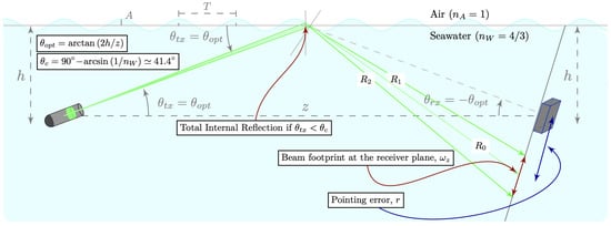 Furthermore, the theoretical framework for a reflective NLOS configuration in a UOWC system indicates that for the light beam generated by the transmitter node to reach the receiver, it must propagate upwards toward the ocean–air interface. Thus, in this study, the light beam was considered to be delimited by two rays, and the transmission angle, , was the angle between the center of the beam emitted towards the ocean surface and the horizontal plane that joins both nodes.
