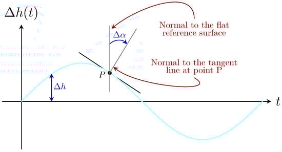 Meanwhile, the incidence point of the optical beam on the ocean surface, denoted as P in Figure 2, is influenced by the wave height variations, , and changes in the angle of the local normal to at that point, represented as . Therefore, in order to determine the precise location of the light beam on the wavy surface and its posterior reflection towards the incident medium, we considered the point of incidence P at time instant t, shown in Figure 2. The continuous variation in the height of the sea surface, , as well as the variation in the angle of the local normal, , cause the reflected rays forming the optical beam to shift their position on the receiver plane.