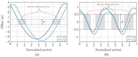The offsets, and , from the center of the receiver to the intersection of the rays and with the receiver plane, respectively, when considering (a) a simple wave and (b) a complex wave, where the shaded area corresponds to the time for which the receiver remains illuminated concerning the period, T, of each wave.