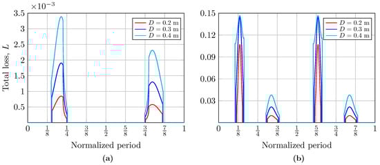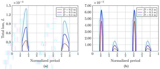 In Figure 4 and Figure 5, we present the computed total loss coefficients, L, as a function of the normalized wave period during the periods in which the receiver is illuminated by the beam reflected by the sea surface, i.e., when the communication system has coverage. Hence, to evaluate the impact of the area of the receiver aperture, the total loss coefficient was calculated for different diameters of meters. In Figure 4 and Figure 5, the curves represent the moments in the period of a single wave at which the receiver is illuminated, thus receiving optical power. The curves on the left correspond to the crest of the wave, while those on the right correspond to its valley. The percentage of time for which the crest and the valley of the wave are illuminated is asymmetric, as can be seen; this explains the scaling of the curves. In addition, under these link conditions, the influence of the size of the aperture diameter of the receiver is evident: an increase in its size improves the received power, which can be observed in the widening of the obtained curves. Likewise, the total losses at the receiver node when the beam is incident on both the crest and valley when considering a complex wave are also shown in Figure 4. Both graphs also allow us to analyze how the Fresnel coefficients influence the calculation of total losses, depending on whether or not the total internal reflection phenomenon is fulfilled. The influence of these coefficients will depend on the link parameters. Their impact tends to vary the loss curves irregularly.