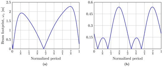 In general terms, Figure 3 shows the offsets and from the center of the receiver to the intersection of the and rays with the receiver plane, as well as the time percentage for which the receiver node remains illuminated concerning the period, T, of the considered wave. Putting it another way, Figure 4 and Figure 5 show the total loss coefficients, L, for different receiver node aperture diameters, analyzed for two water types: clear ocean and coastal waters, respectively. Finally, the beam width of the reflected optical source, , as a function of the period of the wave is shown in Figure 6. It is important to note that the results considering two different types of water are presented only for the calculation of the loss coefficient, L, since the computation of the offsets, and , as well as that of the variable size of the footprint, , does not depend on the type of water. It should be noted that all the results were analyzed considering two types of ocean waves: (a) a simple wave () using a sinusoidal wave with m and Hz, and (b) a complex wave () determined by summing two sinusoidal waves with m, m, Hz, and Hz [26].