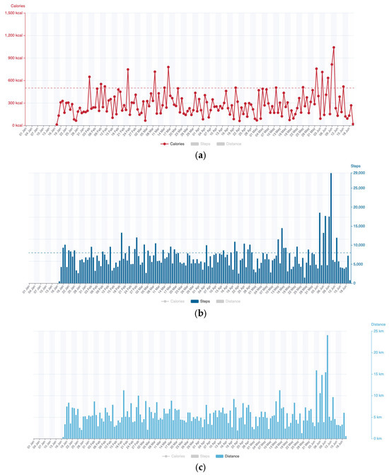 Individualised Scanwatch Report for (a) calories, (b) steps and (c) distance covered during the 6 months.