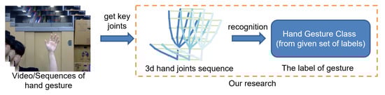 With the rapid development of low-cost depth cameras (such as Microsoft’s Kinect) and gesture estimation (such as Openpose [] and MediaPipe []), we can now easily obtain the precise coordinates of hand joint points and hand skeleton sequences. Therefore, as shown in Figure 1, in this work, a skeleton-based approach is considered.