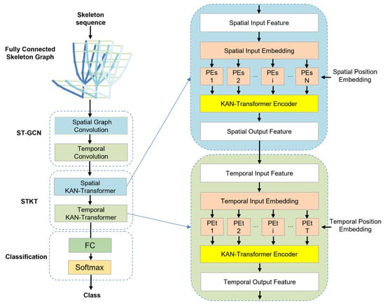 As illustrated in Figure 2, the proposed spatio-temporal graph convolution network and transformer with Kolmogorov–Arnold Network (KAN) model is composed of spatio-temporal graph convolutional network (ST-GCN) modules and spatio-temporal KAN–Transformer modules (ST-KT).