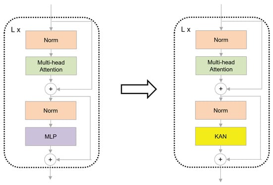 Vision transformer encoder (ViT) [] (left) and the proposed KAN–Transformer encoder block (right).
