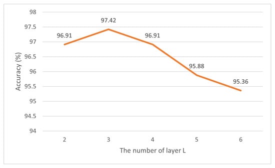 Firstly, to represent the gesture data as a graph structure, a fully connected skeleton graph is constructed from the input hand skeleton sequence. The ST-GCN module is used to extract the primary features from the skeleton sequence. Then, the spatial and temporal features are further extracted through the spatio-temporal transformer module. This module contains a spatial KAN–Transformer (S-KT) and a temporal KAN–Transformer (T-KT), which focus on spatial and temporal features, respectively. The number of input channels to the model is set to 128, 128, 128, 256, 512. For the transformer encoder, a critical component, the number of Multi-Head Self-Attention (MSA) heads is defined as 8, while the number of layers in each module is denoted by L. The configuration enables the model to better learn the relationship between nodes in the gesture sequences and more effectively capture the dynamic changes of gestures.