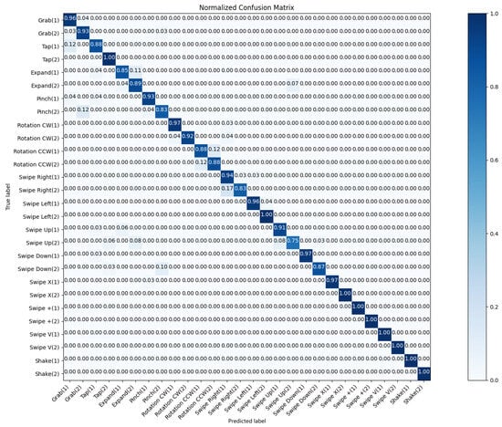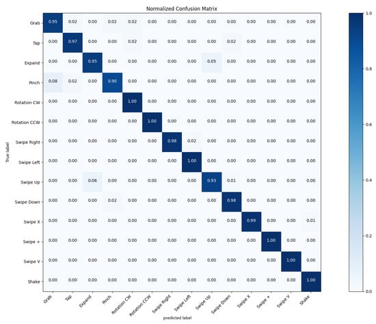 Our model faced challenges in differentiating between certain gesture pairs, such as “Grab” and “pinch”, and “swipe up” and “expand”. These confusions may arise from the visual or dynamic similarities between these gestures.