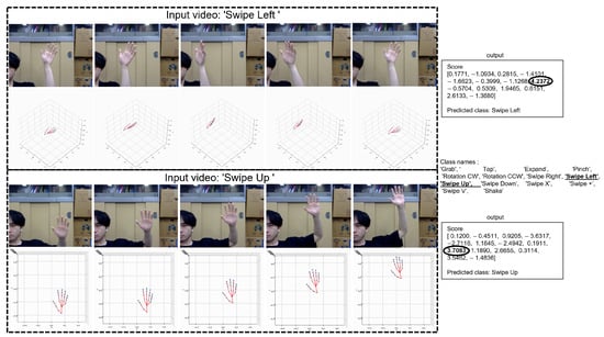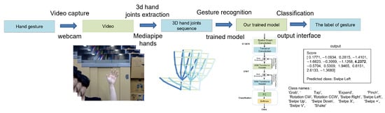 To demonstrate the performance and applicability of the proposed hand gesture recognition model, we developed and tested a demonstration system. The demonstration system is able to recognize gestures based on skeleton data extracted from a single-gesture video. Below, we provide detailed information about the system pipeline, implementation, and output interface.