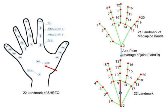 - Hand skeleton extraction module: This module uses the Mediapipe framework to extract 3D hand skeleton data from the video stream. Each hand skeleton is represented as a sequence of 21 joints, each of which is described by its 3D coordinates. It is worth noting that since the pre-trained model uses 22 joint points after Mediapipe extracts the 3D hand skeleton points, we add a palm point by the average of the base of the middle finger and the wrist as shown in Figure 9.Figure 9. Hand skeleton extraction by Mediapipe hands.