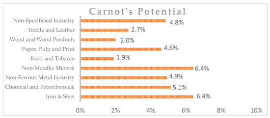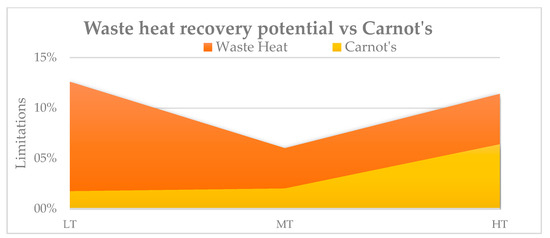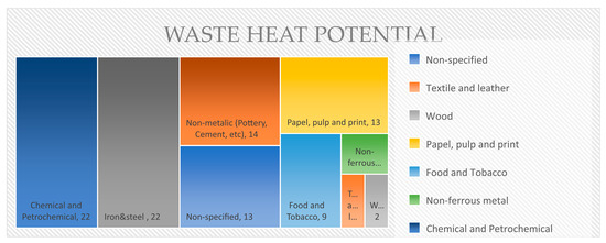 By analyzing the temperature ranges by sectors, the actual available technology, and Carnot’s limitations, it is possible to know the limits of waste heat recovery technology. In this way, Figure 3 shows the waste heat recovery potential by sector [9].