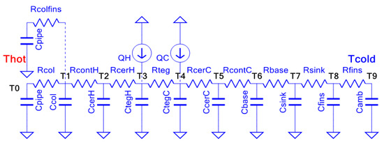 The TGM adds another layer of complexity, as manufacturers often do not provide detailed thermal and electrical properties of the thermoelements. To address this issue, the “effective parameters” approach introduced in [22,23] is applied, allowing the TGM to be modeled in terms of resistive paths, thermal capacitances, and heat sources or collectors. Figure 6 illustrates the HEAT-RU model, which represents the heat transmission channel within the system.