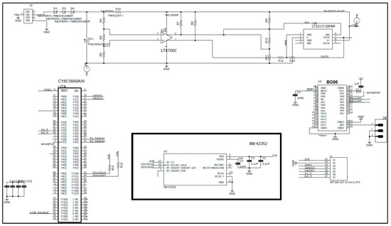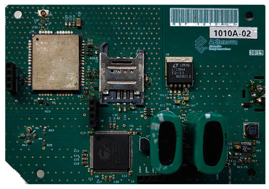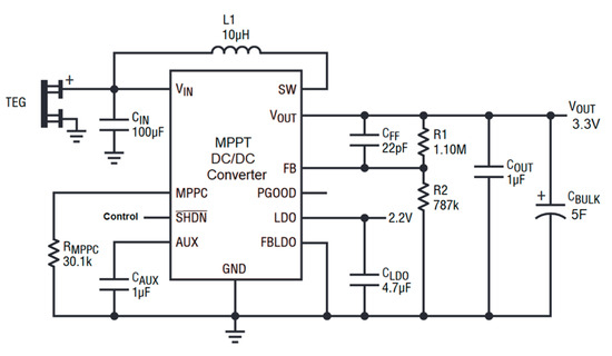The power electronic circuit converts the energy harvested by each thermoelectric generator module into a stable 3.3 V DC output, which powers the IIoT device. As shown in Figure 7, the power electronics system optimizes the TGMs’ performance, ensuring that they operate at maximum efficiency to harvest the most thermal energy possible. The energy is stored in a 5 F supercapacitor, capable of providing sufficient power for up to five complete acquisition and communication processes.