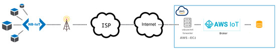 In particular, the IoT Core module from Amazon Web Services uses MQTT + TLS or HTTPS protocols which require x.509 authentication certification. TLS (Transport Layer Security) is a cryptographic protocol designed to provide communications security over any network [25]. The NB-IoT protocol can handle communications with and without the security provided by the carrier.