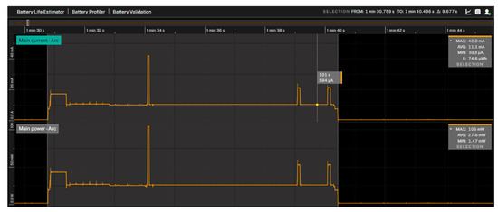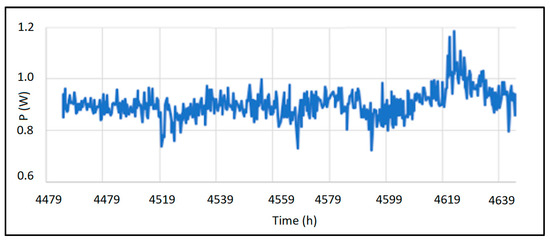 Figure 12 presents data recorded by the thermoelectric generator. It displays the harvested power, converted to 3.3 VDC by the DC/DC converter module. The ambient temperature in the facility was approximately 35 °C.