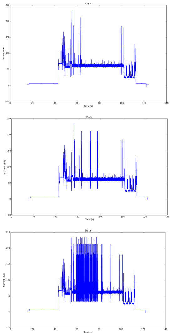 Top: UPD energy profile. Center: MQTT energy profile. Bottom: MQTT TLS energy profile.