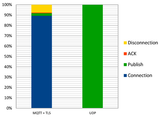 Results comparing NB-IoT and LTE-CATM1 (both protocols are implemented inside the Quectel BG96 chipset) are represented in Table 4, and proportions for UDP and MQTT + TLS in Figure 14.