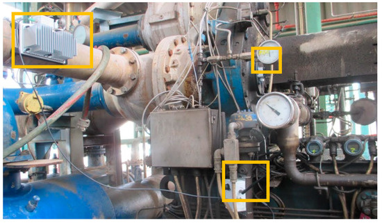 The complete system has been installed to monitor vibrations in an air compressor at a Spanish oil refinery operated by REPSOL SA (Figure 16). The NB-IoT protocol, currently adopted by Spanish carriers Telefónica and Vodafone, enables data transmission. Vibration data are processed by converting measurements from the acceleration domain (in g) to the velocity domain (RMS in mm/s), in compliance with the ISO 10816 standard for predictive maintenance [27]. The analysis covers a frequency range from 1 Hz to 1000 Hz across three axes. Figure 16 illustrates the placement of the system components in the installation. In the figure, the thermoelectric generator (installed in an oil cooling pipeline) is shown in the left-hand box, the NB-IoT device at the bottom, and the three-axis vibration sensor in the right-hand box.
