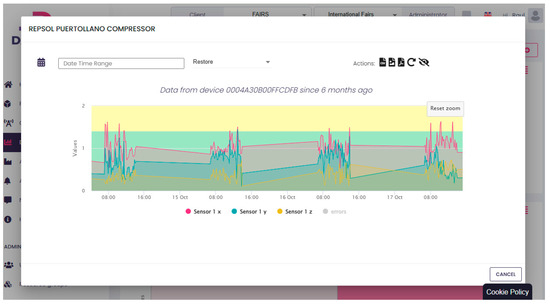 Figure 17 shows the registration of the compressor’s vibrations for a period of four days in Repsol’s Puertollano Oil Refinery (Spain), only operating 8 h per day, from the 14 to 17 October 2024. Data are presented on the AEInnova cloud visualizer tool called DAEVIS (Dynamic AEInnova VISualizer). The figure displays warning vibrations in the compressor for all four days (overpassing the threshold of 1.2 mm/s).