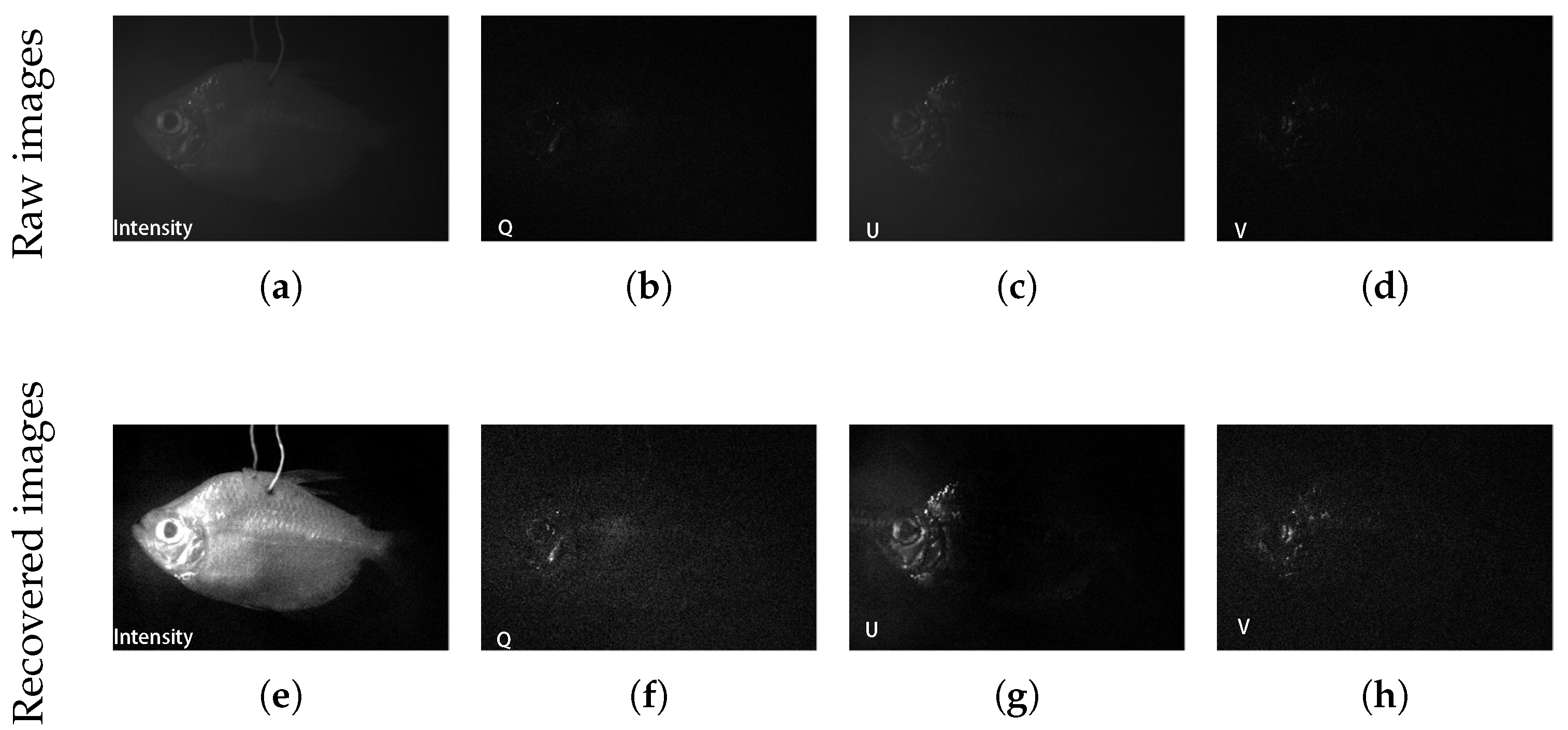 Figure 9a–d shows the intensity, Q-component, U-component, and V-component obtained by the proposed method. It can be seen that the clear-intensity images of the fish can be separated effectively from the ambient light, as shown in