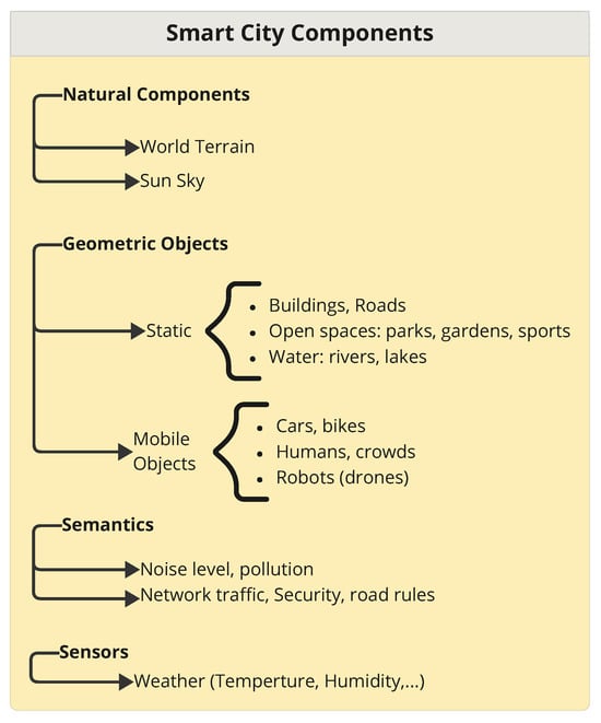 A city is a combination of many components, geometric objects (buildings, houses, and streets), semantics (security and network traffic), and sensors (temperature, humidity, and air quality sensors). With the rapid development of cities, monitoring and managing these components is essential for improving quality of life and saving energy. Smart cities (SCs) have been defined by International Business Machines Corporation (IBM) as cities that use information and communication technology (ICT) to sense, analyze, and integrate the key information of their core systems []. In recent years, many studies have shown interest in 3D city modeling and digital twins, as they allow for the creation smart city applications in which decision makers can perform analyses, simulations, planning, and monitoring in different domains (energy management, urban planning, and weather simulation). Many approaches have been proposed, such as CityGML, CityJson, and the combination of Building Information Modeling (BIM) and Geographic Information System (GIS) modeling to provide City Information Modeling (CIM) []. Lam et al. [] successfully implemented a method for converting Industry Foundation Class (IFC) data to 3D city models and evaluated the results through visualization across multiple applications. This method lays a promising foundation for future smart city applications, as it can comprehensively map all IFC data to 3D city models, enabling the seamless integration of building information modeling (BIM) into smart city platforms. As shown in Figure 1, a smart city includes four main components: natural components (e.g., world terrain and Sun), geometric objects (static and mobile objects), semantics (e.g., noise level, network traffic, etc.), and sensors (e.g., weather sensors, etc.). These are the basic elements required to monitor and manage a smart city. Cities: Skyline, a popular game, can be described as a single-player, open-ended city-building simulation []. Players engage in urban planning by establishing a road network; controlling zoning; and providing public services such as budgeting, education, employment, pollution management, etc. Based on this concept, leveraging a 3D city model, we focus on visualizing housing objectsand weather conditions to keep track of rapidly changing conditions.