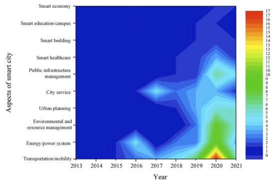 A contour map was built by Hao Wang et al. [], with colors from cool to warm to reflecting low to high research intensity by topic, describing the distribution and concentration of studies based on the time scale and knowledge management. Figure 2 highlights a red area for transportation/mobility in 2020, indicating that this sector is the most extensively researched. Additionally, warm-toned areas are visible in other aspects of smart cities (SCs), such as energy/power systems, environmental and resource management, and public infrastructure management, suggesting frequent applications of digital twin (DT) technology in these domains. The figure also reveals that DTs have not yet been widely adopted in smart education (9) and the smart economy (10). Overall, research on DT technology has garnered significant attention in recent years. An early fire detection system was trained using synthetic data, following the method proposed in [], demonstrating its potential as a use case within DT environments. Geographic Virtual City Miniature (GeoVCM) [] demonstrates an application that integrates both real and virtual IoT devices into a digital twin (DT) platform, allowing city managers to interact with and monitor urban environments in real time. A DT version of a two-story building in Larisa, northern Greece, was developed in [], allowing managers to monitor sensor values in each room and track the building’s electricity consumption. The Intelligent Transportation System [] incorporates numerous IoT devices to integrate multi-dimensional and multi-state data into a collaborative data framework. This system enables the visualization of traffic flow and other details related to vehicles on the implemented roads, providing real-time insights into traffic conditions and vehicle movements.