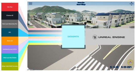 Among the important components that create smart city applications are houses and buildings. To import them into the application, we converted data from Revit () to static mesh by leveraging the DataSmith plugin. As shown in Figure 6, Datasmith is a suite of tools and plugins designed to import complete pre-constructed scenes and complex assets from various industry-standard design applications into Unreal Engine. During the conversion of a Revit file to Datasmith format, the geographic data are preserved to position the houses accurately in the correct coordinates of the Cesium globe.