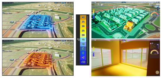 - Temperature: Color correction with dynamic color temperature is employed to map environmental temperature values to the corresponding color. As described in Equation (3), adjusting the white balance value directly influences the temperature color, causing the visual representation of temperature to change accordingly. This allows for a more accurate depiction of environmental conditions by mapping temperature variations to specific color gradients. The color gradient ranges from orange–red (indicating hot temperatures) to blue (indicating cold temperatures), as illustrated in the legend in Figure 8.where W is the white balance value and T is the air temperature value.