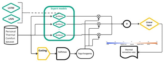 The indoor environment is the main factor affecting the health and well-being of residents/occupants. Thermal comfort refers to the condition of being physically and psychologically comfortable with the surrounding environment, especially the temperature. It is measured by various indices, such as Predicted Mean Vote (PMV), Predicted Percentage of Dissatisfied (PPD), and thermal sensation vote, which are the most prominent conventional methods []. Thermal comfort (TC) has been applied in buildings and houses by designing, suggesting, and controlling heating, ventilation, and air conditioning (HVAC) systems to maintain an optimal indoor temperature, relative humidity, and air movements. HVAC systems consume up to 50% of the total energy budget of a building, amounting to a staggering 20% of the total energy consumption in the USA []. There is a worldwide standard, ASHRAE 55 [], determining a satisfactory thermal environment in occupied spaces and compliance documents. These indices assess thermal comfort levels by incorporating factors such as temperature, humidity, air velocity, clothing insulation, and metabolic rate. The development of personal comfort models requires the collection of extensive sensor-related measurements and user-labeled data, a process that can be highly intrusive and labor-intensive. To address this, Zeynep et al. [] proposed a hybrid active learning framework aimed at reducing data collection costs while developing data-efficient and robust models. Many researchers have referenced their study on the three popular thermal comfort metrics shown in Figure 3: Thermal Sensation Vote (TSV), Thermal Preference Vote (TPC), and Thermal Comfort Vote (TCV). A deep neural network called DeepComfort [] was proposed based on multi-task learning to predict the three most important thermal comfort metric, achieving 90% accuracy on a combination of the ASHRAE II dataset [] and self-collected primary student dataset. We primarily rely on TSV (thermal sensation vote) to evaluate our thermal comfort model, as this metric reflects how individuals perceive the current environmental conditions, aligning closely with our objective. Through the use of thermal comfort, we can analyze the effectiveness of HVAC systems, as well as make some suggestions to control the system to save on energy consumption. We build thermal comfort using a Mixture-of-Expert (MoE) model architecture with two main backbones, namely Long Short-Term Memory (LSTM) and a Liquid Neural Network (LNN), integrated with the transformer architecture for evaluation, analysis, and comparison.