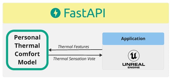 As shown in Figure 4, our method integrates natural components, static geographic objects, and environmental sensor data (Section 2.1.1) into a platform built using Unreal Engine, as detailed in Section 2.2. OpenWeather is utilized to collect and transfer weather-related data to both the platform and the thermal comfort model. This model (Section 2.3) is powered by personal and environmental data (Section 2.1.2) and is connected to the platform through FastAPI (Section 2.4).