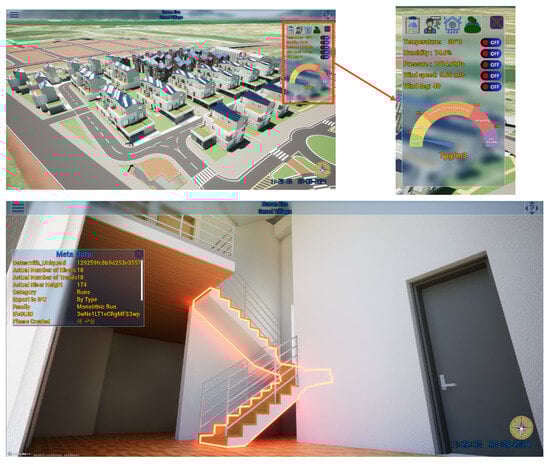 For interactive computer graphics applications, a suitable frame rate typically ranges from 30 to 60 FPS, which ensures smooth performance and responsiveness for general use cases like user interfaces and dashboards []. The hardware setup included high-performance machines equipped with NVIDIA RTX A4000 GPUs, 32GB of memory, and 500GB SSD storage to manage computationally intensive tasks such as rendering and machine learning model inference. The platform was built using Python for data processing, Unreal Engine for 3D visualization, Blueprint programming for the creation of functions, and Pytorch for deep learning model integration. Data from IoT sensors, such as temperature and humidity sensors, were transmitted via HTTP protocol, ensuring low-latency communication. Geographic data integration was achieved using CesiumJS and CityGML, allowing for precise mapping of urban infrastructure. With our proposed method, the platform maintains a frame rate of approximately 40 frames per second (fps), representing an improvement in performance for 3D smart city platforms compared to other studies [,,]. This enhanced frame rate ensures smoother and more responsive visualization, contributing to a better user experience and more effective real-time data analysis. As shown in Figure 13, the platform allows users to easily navigate inside a house and query detailed information related to its components. Additionally, the material of each component is preserved and visualized, providing a clearer understanding of the house’s structure and construction, further enhancing the user’s interaction and comprehension of the built environment.