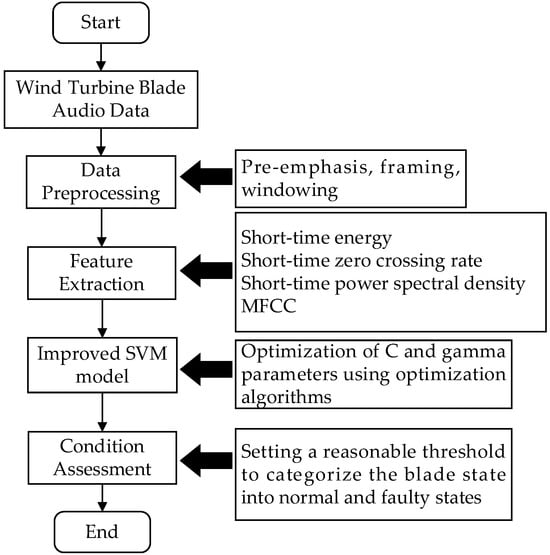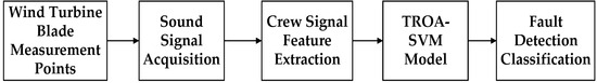 Under the influence of external wind, wind turbines generate torque through their internal wind guiding mechanisms and blades, converting wind energy into mechanical energy. However, due to various influences, including wind conditions, mechanical factors, and operational environments, wind turbines are susceptible to failures during work. In this paper, we propose a novel approach utilizing acoustic signal acquisition equipment strategically positioned at various measurement points on the wind turbine to accurately and effectively collect sound signals from the blades. Following data collection, the fault features are extracted by using three analysis methods, i.e., the time domain analysis, time–frequency domain analysis, and cepstral domain analysis. These extracted features are then input into a machine learning model for assessing the working state of the blades and effectively detect any faults, as shown in Figure 1.
