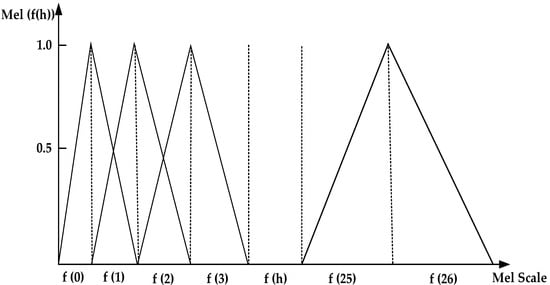 The Mel Frequency Cepstral Coefficient (MFCC) [25] is a method based on the principles of the human auditory system, and it is widely used for analyzing audio signals. It simulates the critical bandwidth characteristics of the human ear by designing a set of triangular bandpass filter banks arranged from sparse to dense, covering the range from low frequency to high frequency. Usually, the number of filter banks is similar to the number of critical bands. In practice, the number of filter banks H is 22–26. In this paper, H = 26. The MFCC triangular filter is shown in Figure 2.