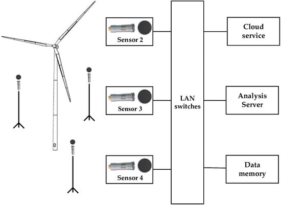 The experimental platform mainly includes sound sensors, voiceprint monitoring equipment, local area network switches, data storage and analysis servers, cloud server platforms, and other equipment. Due to the strong interference at the wind turbine site, the sound pickup device is arranged around the wind turbine tower, and according to the characteristics of the wind turbine and the need for acoustic acquisition, the sensor is erected on the downwind side (i.e., the direction of wind avoidance when the blades are rotating) of the wind turbine blades through the bracket, and is kept at least 3.5 m from the center of the tower with a mounting height higher than 2.1 m in order to obtain the optimal signal-to-noise ratio. Considering that the blade rotation plane will change with the wind direction, it is necessary to use multiple pickup sensors for signal acquisition to ensure the comprehensiveness and accuracy of the data. The pickup sensor is wrapped with a sponge to reduce the interference of ambient noise, so as to obtain a higher quality measurement signal. When the acquired raw signal first enters the signal conditioning module, the signal conditioning module filters and amplifies the acquired noise signal to improve the signal-to-noise ratio. The conditioned signal is then digitized by the data acquisition card. These digitized data are transmitted to the analysis and storage server through a high-speed communication link for later data processing and analysis. The diagram of fault detection experimental platform for the wind turbine blade is shown in Figure 4.