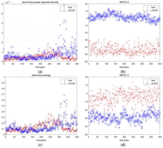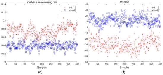 Feature distributions of normal and faulty samples. (a) Short—time power spectral density; (b) the 2nd MFCC; (c) short—time energy; (d) the 3rd MFCC; (e) short—time zero crossing rate; (f) the 3rd MFCC.