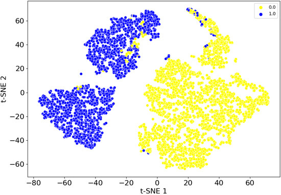 To further compare the detection performance, t-SNE was used to visualize the diagnostic results (classification results), which is shown in Figure 9. In the figure, the yellow dots represent normal category ‘0’, and the blue dots represent the fault category ‘1’. As shown in Figure 9, although the fault samples and normal samples could be effectively separated, there are still cases wherein a small number of samples were incorrectly identified, i.e., a very small number of fault samples (blue dots) were erroneously detected as normal samples (yellow dots). Similarly, a very small number of normal samples (yellow dots) were mistakenly identified as faulty samples (blue dots). However, this classification