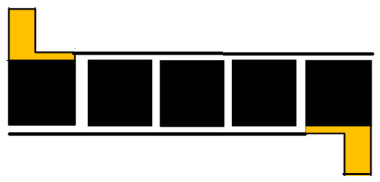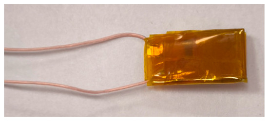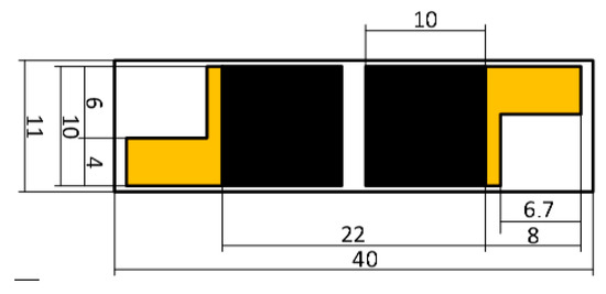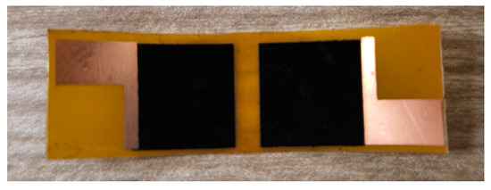 The fabrication of the tactile sensor used in the glove was primarily based on the findings in paper [44], with certain modifications. The tactile sensor consists of two parts: laser-induced graphene (LIG) and reduced graphene oxide (rGO) [45]. In the first part of the fabrication process, foil-coated polyimide was used. The application of photolithography to the surface of the foil polyimide facilitates the formation of conductive areas. These areas are intended for two principal functions; firstly, to serve as solder points for connecting wires, and secondly, to facilitate contact with graphene. It is necessary to point out that during the laser induction of graphene it has contact with the foil. Flexible, heat-resistant copper wires with Teflon insulation, with a cross-section of 0.07 mm2, were soldered to each foil part. Figure 2 shows the scheme of the first sensor part.