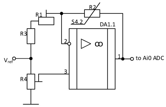 where R4.1 is the upper part of the adjustable resistor R4 relative to the moving contact, and R4.2 is the lower part of the adjustable resistor R4 relative to the moving contact. Resistor R2 is a tactile sensor.